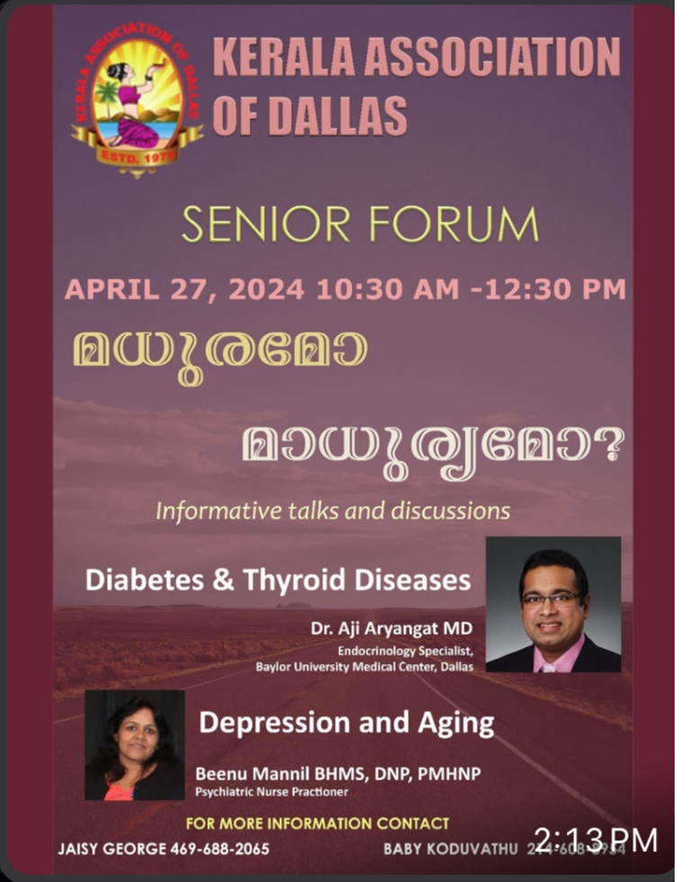 ഗാർലൻഡ് (ഡാളസ് ): കേരള അസോസിയേഷൻ ഓഫ് ഡാലസിന്റെ ആഭിമുഖ്യത്തിൽ സീനിയർ ഫോറം “മധുരമോ മാധുര്യമോ”സംഘടിപ്പിക്കുന്നു ഏപ്രിൽ 27 ശനിയാഴ്ച രാവിലെ 10 30 മുതലാണ് പരിപാടികൾ ആരംഭിക്കുന്നത് .പ്രസിഡന്റ് പ്രദീപ് നാഗനൂലിന്റെ അധ്യക്ഷതയിൽ ചേരുന്ന ചേരുന്ന യോഗത്തിൽ തൈറോയ്ഡ് ഡിസീസ്എന്ന വിഷയത്തെ അധികരിച്ച് ഡോ:അജി ആര്യൻകാട്ടും, ഡിപ്രഷൻ ആൻഡ് ഏജിഗിനെ കുറിച്ച് ബീന മണ്ണിൽ (സൈക്യാട്രിക് നഴ്സ് പ്രാക്റ്റീഷനർ) പ്രഭാഷണം നടത്തും.