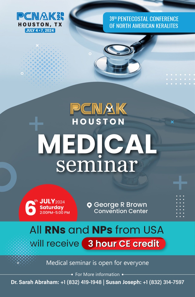 ന്യൂയോർക്ക്: ഹൂസ്റ്റണിൽ വച്ച് നടത്തപ്പെടുന്ന മലയാളി പെന്തക്കോസ്ത് കോൺഫ്രൻസിൽ രജിസ്റ്റർ ചെയ്ത് പങ്കെടുക്കുന്നവർക്കായി മെഡിക്കൽ സെമിനാർ നടത്തപ്പെടുന്നു. നഴ്‌സ് പ്രാക്ടീഷണർമാർക്കും രജിസ്ട്രേഡ് നഴ്‌സുമാർക്കുമായി യൂണിവേഴ്സിറ്റി ഓഫ് ടെക്സസ് മെഡിക്കൽ ബ്രാഞ്ച് (യു.ടി.എം.ബി) ഹെൽത്ത് അംഗീകരിച്ച സി. ഇ ക്രെഡിറ്റുകൾ നേടുന്നതിന് ഈ അവസരം ഉപയോഗിക്കാം.