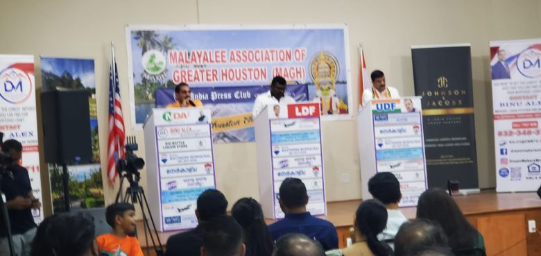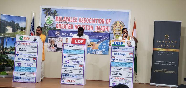 ഏപ്രിൽ 19നു വെള്ളിയഴ്ച വൈകുന്നേരാം ഹൂസ്റ്റണിലെ മാഗിന്റെ ആസ്ഥാന ആസ്ഥാന കേന്ദ്രമായ കേരള ഹൗസിൽ നടന്ന ഇലക്ഷൻ സംവാദം അക്ഷരാർത്ഥത്തിൽ മൂന്നു മുന്നണികളുടെ പോരാട്ടം തന്നെയായിരുന്നു. അങ്കത്തട്ട്@ അമേരിക്ക എന്ന പേരിൽ ഇന്ത്യ പ്രസ് ക്ലബ് ഓഫ് നോർത്ത് അമേരിക്കയുടെയും (ഐ പിസിഎൻഎ ) മലയാളി അസ്സോസിയേഷൻ ഓഫ് ഗ്രെയ്റ്റർ ഹൂസ്റ്റന്റെയും (മാഗ്) സംയുക്താഭിമുഖ്യത്തിൽ നടന്ന സംവാദം വീറും വാശിയും നിറഞ്ഞ, രാഷ്ട്രീയ ചോദ്യോത്തരങ്ങളുടെ വേദിയായി മാറിയപ്പോൾ ആസന്നമായിരിക്കുന്ന ഇന്ത്യയിലെ 18ാമത് പാർലമെന്റ് തിരഞ്ഞെടുപ്പിനെ പ്രവാസികൾ എത്ര ഗൗരവത്തോടെയാണ് കാണുന്നതിന്റെ നേര്കാഴ്ചയായിരുന്നു ഈ ഇലക്ഷൻ സംവാദം.ഇന്ത്യൻ,അമേരിക്കൻ ദേശീയ ഗാനങ്ങളോടെ ആരംഭിച്ച പ്രാരംഭ സമ്മേളനത്തിൽ മാഗ് പ്രസിഡണ്ട് മാത്യൂസ് മുണ്ടയ്ക്കൽ സ്വാഗതമാശംസിച്ചു. ഫോർട്ട് ബെൻഡ് കൗണ്ടി ഡിസ്ട്രിക്ട് ജഡ്ജ് സുരേന്ദ്രൻ.കെ.പട്ടേൽ, ഐപിസിഎൻഎ ഹൂസ്റ്റൺ ചാപ്റ്റർ പ്രസിഡണ്ട് സൈമൺ വളാച്ചേരിൽ എന്നിവർ ആശംസകൾ അറിയിച്ചു.