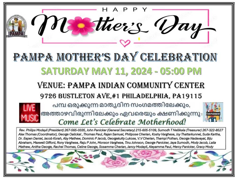 ഫിലാഡല്ഫിയ : പമ്പ മലയാളി അസ്സോസിയേഷന്റെ വാര്ഷിക കുടുംബ സംഗമവും, 2024-ലെ പ്രവര്ത്തനോത്ഘാടനവും, മാതൃദിനാഘോഷവും സംയുക്തമായി മെയ് 11-ന് ശനിയാഴ്ച വൈകുന്നേരം 5-മണിക്ക് പമ്പ ഇന്ത്യന് കമ്മ്യൂണിറ്റി സെന്ററില് (9726 Bustleton Ave Unit #1, Philadelphia, PA 19115) നടത്തുന്നു.