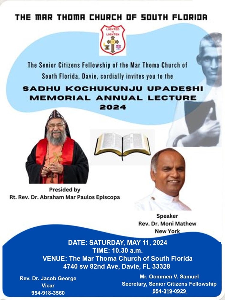 ഫ്ലോറിഡ: മൂത്താംമ്പക്കൽ സാധു കൊച്ചുകുഞ്ഞ് ഉപദേശി മെമ്മോറിയൽ വാർഷിക പ്രഭാഷണ പരമ്പര സൗത്ത് ഫ്ലോറിഡാ മാർത്തോമ്മാ ഇടവക സീനിയർ സിറ്റിസൺ ഫെലോഷിപ്പിന്റെ നേതൃത്വത്തിൽ മെയ് 11 ശനിയാഴ്ച രാവിലെ 10.30 ന് മാർത്തോമ്മാ സഭയുടെ നോർത്ത് അമേരിക്ക ഭദ്രാസനാധ്യക്ഷൻ ബിഷപ് ഡോ. എബ്രഹാം മാർ പൗലോസ് ഉത്ഘാടനം ചെയ്യും.