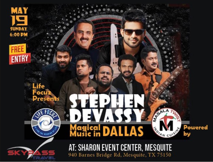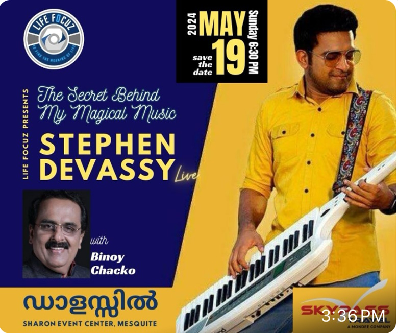 മസ്ക്വിറ്റ് (ഡാളസ് ):സംഗീതോപകരണങ്ങളിൽ മാസ്മരിക താളമേളങ്ങളൊരുക്കുന്ന സ്റ്റീഫൻ ദേവസ്യടീം അവതരിപ്പിക്കുന്ന “മാജിക് മ്യൂസിക്” ഡാലസിൽ മെയ് 19 ന് അരങ്ങേറും ,ലൈഫ് ഫോക്കസ് ഒരുക്കുന്ന സംഗീത പരിപാടിക്ക് വേദിയൊരുങ്ങുന്നത് അത്യാധുനിക സൗകര്യങ്ങളോടെ ഈയിടെ പണിതീർത്ത ഷാരൻ ഇവൻറ് സെന്ററിലാണ് . ഞായറാഴ്ച വൈകീട്ട് 6 മണിക് ആരംഭിക്കുന്ന ഈ പരിപാടിയിലേക്കുള്ള പ്രവേശനം തികച്ചും സൗജന്യമാണ് എല്ലാവരെയും ഈ പരിപാടിയിലേക്ക് സ്വാഗതം ചെയ്യുന്നതായി ലൈഫ് ഫോക്കസ് സംഘാടകർ അറിയിച്ചു സ്ഥലം: ഷാരൻ ഇവൻറ് സെൻറർ ,940 Barnes Bridge Rd Mesquite 78150
