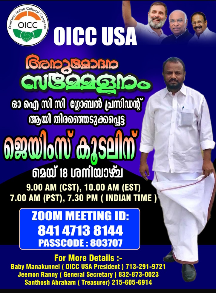 ശനിയാഴ്ച (മെയ് 18) രാവിലെ ഹൂസ്റ്റൺ സമയം 9:00 am / NY സമയം 10:00 am NY സമയം 7:00 am PST ന് ജെയിംസിനെ അഭിനന്ദിക്കാൻ സൂം മീറ്റിംഗ് ക്രമീകരിക്കുന്നു.എല്ലാ ഒഐസിസി യുഎസ്എ അംഗങ്ങളും അഭ്യുദയകാംക്ഷികളും യോഗത്തിൽ പങ്കെടുക്കണമെന്ന് ഭാരവാഹികൾ അറിയിച്ചു