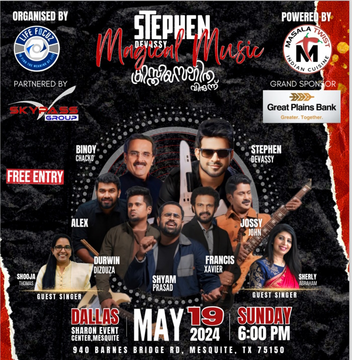 മെസ്ക്വിറ്റ്, ഡാളസ്: സംഗീത ലോകത്ത് ഏറെ പ്രസിദ്ധനായ സ്റ്റീഫൻ ദേവസി നയിക്കുന്ന ക്രിസ്തീയ സംഗീത വിരുന്ന് ഡാളസിലെ ശാരോൻ ഇവന്റ് സെന്ററിൽ വെച്ച് മെയ് മാസം 19 ഞായറാഴ്ച വൈകുന്നേരം 6 മണിക്ക് നടത്തപ്പെടുന്നു. സുപ്രസിദ്ധ ക്രൈസ്തവ ഗായകൻ ബിനോയ് ചാക്കോ ഉൾപ്പെടെ സംഗീത ലോകത്തെ പ്രമുഖർ ഈ പ്രോഗ്രാമിൽ അണിനിരക്കുന്നു. ടി ജെ അലക്സ്, ദുർവിൻ ഡിസൂസ, ശ്യാം പ്രസാദ്, ഫ്രാൻസിസ് സേവ്യർ, ജോസി ജോൺ, ഷൂജാ തോമസ്, ഷേർളി എബ്രഹാം തുടങ്ങിയ പ്രമുഖർ ഗാനങ്ങൾ ആലപിക്കുകയും സംഗീത ഉപകരണങ്ങൾ വായിക്കുകയും ചെയ്യുന്നു.