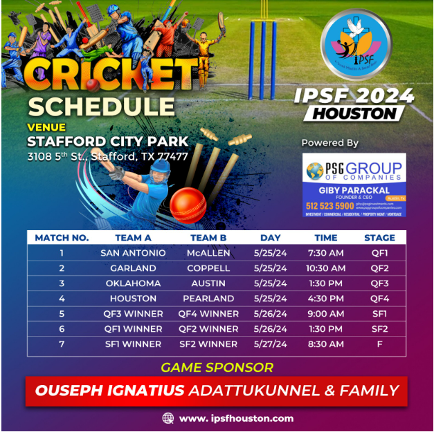 ഹൂസ്റ്റൺ: ചിക്കാഗോ സെൻറ് തോമസ് സീറോ മലബാർ രൂപതയുടെ കീഴിലുള്ള ടെക്സാസ് – ഒക്ലഹോമ റീജിയനിലെ 8 പാരീഷുകൾ പങ്കെടുക്കുന്ന ഇന്റർ പാരീഷ് സ്പോർട്സ് ഫെസ്റ്റ് (IPSF), മെയ് 25 മുതൽ 27 വരെ ഹൂസ്റ്റൺ സ്റ്റാഫോർഡ് സിറ്റി പാർക്കിൽ നടക്കുന്ന ക്രിക്കറ്റ് മത്സരങ്ങളോടെ ആരംഭിക്കുന്നു.