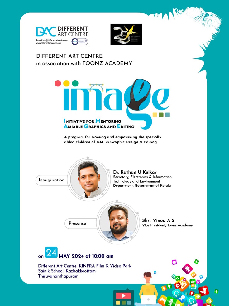 തിരുവനന്തപുരം: കഴക്കൂട്ടം ഡിഫറൻറ് ആര്‍ട് സെന്ററിലെ (ഡി എ സി) ഭിന്നശേഷിക്കുട്ടികള്‍ക്കായി ഗ്രാഫിക് ഡിസൈന്‍, എഡിറ്റിംഗ് പരിശീലന പദ്ധതിക്ക് നാളെ (വെള്ളി) തുടക്കം കുറിക്കുന്നു. ഭിന്നശേഷിക്കുട്ടികളില്‍ തൊഴില്‍ നൈപുണി വികസിപ്പിക്കുവാനും തൊഴില്‍സാധ്യത വര്‍ദ്ധിപ്പിക്കുവാനുമായി ടൂണ്‍സ് അക്കാദമിയുടെ സഹകരണത്തോടെയാണ് ഡിഫറൻറ് ആര്‍ട് സെന്ററില്‍ ഇമേജ് എന്ന പേരില്‍ പദ്ധതി ആരംഭിക്കുന്നത്.