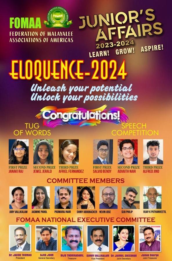 ഷിക്കാഗോ : ഫോമാ ജൂനിയർ അഫയേഴ്‌സ് കമ്മറ്റിയുടെ ആഭിമുഖ്യത്തിൽ ഗ്രേഡ് 5 മുതൽ ഗ്രേഡ് 12 വരെയുള്ള സ്കൂൾ കുട്ടികൾക്കായി എലോക്വൻസ്‌ 2024 എന്ന പേരിൽ നടത്തപ്പെട്ട മത്സരം വൻവിജയം, അഞ്ചാം ക്‌ളാസ് മുതൽ ഏഴാം ക്‌ളാസ് വരെയുള്ള കുട്ടികൾക്കായി ടഗ് ഓഫ് വേഡ്‌സും സിനോനിം ഗെയ്‌മും ചേർന്നുള്ള മത്സരവും എട്ടാം ക്‌ളാസ്സു മുതൽ പന്ത്രണ്ടാം ക്‌ളാസ്സു വരെയുള്ള കുട്ടികൾക്കായി പ്രസംഗമത്സരവുമാണ് അരങ്ങേറിയത്, പ്രിലിമിനറി റൌണ്ട്, സെമി ഫൈനൽ റൌണ്ട്, ഫൈനൽ റൌണ്ട് എന്നിങ്ങനെ മൂന്നു റൗണ്ടുകളിലായി നടന്ന വാശിയേറിയ മത്സരങ്ങളിലാണ് വിജയികളെ കണ്ടെത്തിയത്, ഫൈനൽ മത്സരങ്ങളിൽ ഓരോ വിഭാഗത്തിലും ഏഴു മത്സരാർഥികൾ വീതം മാറ്റുരച്ചു, അവസാനം ടഗ് ഓഫ് വേഡ്‌സ് വിഭാഗത്തിൽ ഫ്‌ലോറിഡയിൽ നിന്നുള്ള ജാനകി രാജ് ഒന്നാം സ്ഥാനവും രണ്ടും മൂന്നും സ്ഥാനങ്ങളിൽ ന്യൂ ജേഴ്സിയിൽ നിന്നുള്ള ജ്യൂവൽ ജറാൾഡ്, അഫ്രിയൽ ഫെർണാണ്ടസ് എന്നിവരും കരസ്ഥമാക്കി.