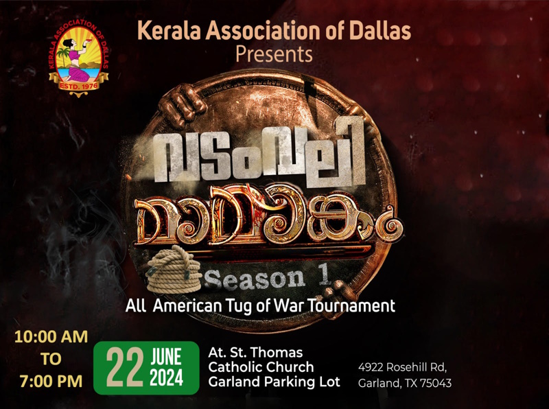 ഡാളസ് : കേരളാ അസോസിയേഷൻ ഓഫ് ഡാളസ് ജൂൺ 22നു നടത്തുന്ന ഒന്നാമത് ആൾ അമേരിക്കൻ വടംവലിമാമാങ്കത്തിന്റെ ഒഫിഷ്യൽ കിക്കോഫ് ജൂൺ 14 വെള്ളിയാഴ്ച വൈകുന്നേരം ഏഴു മണിക്ക് ഗാര്ലന്റിലെ ഐസിഈസി ഓഡിറ്റോറിയത്തിൽ നടക്കും.
