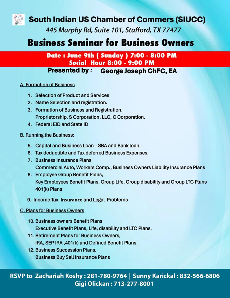 ഹൂസ്റ്റൺ: സൗത്ത് ഇന്ത്യൻ യുഎസ് ചേംബർ ഓഫ് കൊമേഴ്സിന്റെ (SIUCC) ആഭിമുഖ്യത്തിൽ നടത്തിയ വ്യവസായ സംരംഭക സെമിനാർ സംരംഭക പങ്കാളിത്തം കൊണ്ടും ഇൻഷുറൻസ് രംഗത്ത് ദീർഘവർഷങ്ങളുടെ അനുഭവ സമ്പത്തും പരിചയ സമ്പന്നനുമായ പ്രമുഖ ഇൻഷുറൻസ് ബ്രോക്കർ ജോർജ് ജോസഫിന്റെ ക്ലാസുകൾ കൊണ്ടും ശ്രദ്ധേയമായി മാറി.