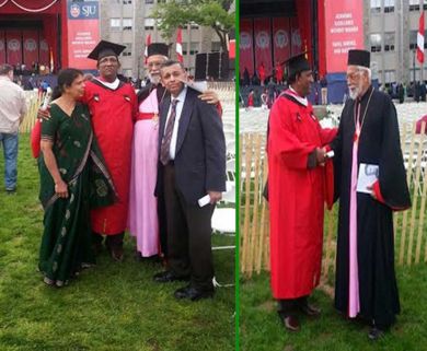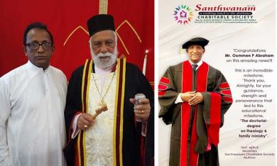 ന്യൂയോർക്ക്: ഉമ്മന് പി. ഏബ്രഹാമിന് എച്ച്ജെ. ഇന്റര്നാഷ്ണല് ഗ്രാജുവേറ്റ് സ്ക്കൂള് ഫോര് പീസ് ആന്റ് ലീഡര്ഷിപ്പില് നിന്ന് ഡോക്ടറേറ്റ് ലഭിച്ചു. ഡോ. പ്രൊഫ. ഡ്രിസ കോണ്, ഡോ. പ്രൊഫ. ജേക്കബ് ഡേവിഡ് എന്നിവരുടെ മേല്നോട്ടത്തിലാണ് ഗവേഷണം പൂര്ത്തിയാക്കിയത്. ‘തിയോളജി എംഫസിസ് ഓണ് ഫാമിലി മിനിസ്റ്ററി ആന്റ് എഡ്യൂക്കേഷൻ’ എന്നതായിരുന്നു ഗവേഷണ വിഷയം .