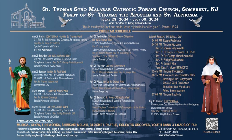 ന്യൂജേഴ്സി: സോമര്സെറ്റ് സെന്റ് തോമസ് സീറോ മലബാര് കാത്തലിക് ഫൊറോനാ ദേവാലത്തിൽ ഭാരതത്തിന്റെ അപ്പസ്തോലനും, നമ്മുടെ വിശ്വാസത്തിന്റെ പിതാവും, ഇടവക മധ്യസ്ഥനുമായ വിശുദ്ധ തോമാശ്ശീഹായുടേയും, ഭാരതത്തിലെ ആദ്യ വിശുദ്ധ, അല്ഫോന്സാമ്മയുടേയും തിരുനാള്, ജൂൺ 28 – മുതല് ജൂലൈ 7 – വരെ സംയുക്തമായി കൊണ്ടാടുന്നതായി ഇടവക വികാരി ഫാ. ആൻ്റണി പുല്ലുകാട്ട് സേവ്യർ അറിയിച്ചു.