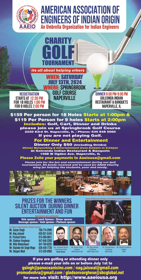 ഷിക്കാഗോ: അമേരിക്കന് അസോസിയേഷന് ഓഫ് എഞ്ചിനീയേഴ്സ് ഓഫ് ഇന്ത്യന് ഒറിജിന് (AAEIO) യുടെ ഈ വര്ഷത്തെ ചാരിറ്റി ഗോള്ഫ് ടൂര്ണമെന്റ് നേപ്പര്വില്ലയിലുള്ള സ്പ്രിംഗ് ബ്രൂക്ക് ഗോള്ഫ് ക്ലബില് വച്ച് നടത്തുമെന്ന് എ.എ.ഇ.ഐ.ഒ പ്രസിഡന്റ് ഗ്ലാഡ്സണ് വര്ഗീസ് അറിയിച്ചു.