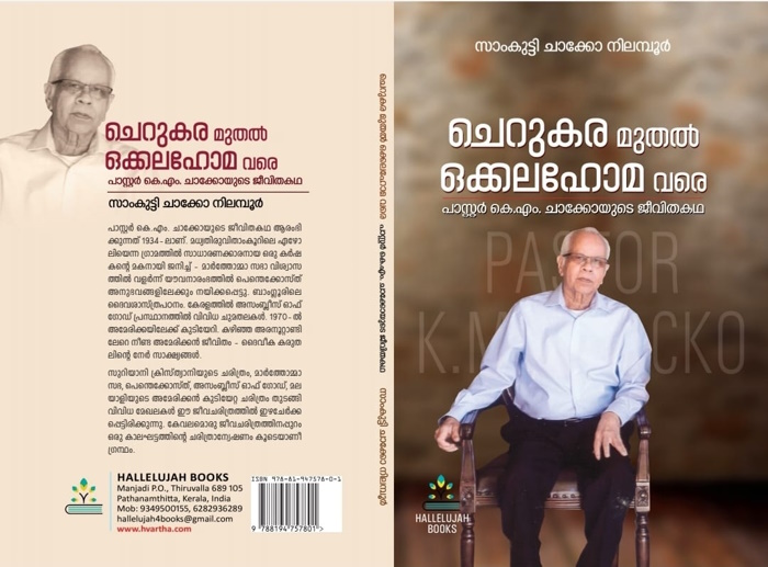 ഒക്കലഹോമ: ഒക്കലഹോമ സിറ്റിയിലെ ആദ്യകാല മലയാളി പെന്തെക്കോസ്ത് ശുശ്രൂഷകരിലൊരാളായ പാസ്റ്റർ കെ.എം.ചാക്കോയുടെ ജീവചരിത്ര ഗ്രന്ഥം- “ചെറുകര മുതൽ ഒക്കലഹോമവരെ ” – പ്രകാശനം ചെയ്തു. ഹാലേലൂയ്യാ പത്രാധിപരും ഗ്രന്ഥകാരനുമായ സാംകുട്ടി ചാക്കോ നിലമ്പൂരാണ് പുസ്തകരചന നിർവ്വഹിച്ചിരിക്കുന്നത്. തിരുവല്ല ഹാലേലൂയ്യ ബുക്സാണ് പ്രസാധകർ