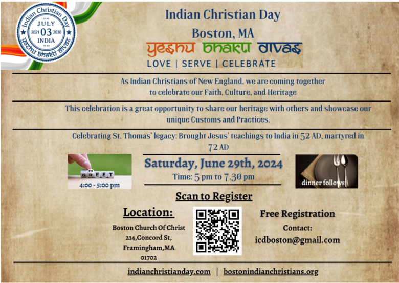 ന്യൂയോർക്ക്: ഇന്ത്യൻ ക്രിസ്ത്യൻ പാരമ്പര്യങ്ങളുടെ അഗാധമായ സ്വാധീനത്തെ ആദരിച്ചുകൊണ്ട്, സാമൂഹിക ഘടനയിൽ കാര്യമായ സംഭാവനകൾ നൽകിയിട്ടുള്ള ഇന്ത്യൻ ക്രിസ്ത്യൻ സമൂഹത്തിനു വേണ്ടി, ബോസ്റ്റണിൽ ഇന്ത്യൻ ക്രിസ്ത്യൻ ദിനാഘോഷങ്ങൾ നടത്തപ്പെടുന്നു. ജൂൺ 29 ന് ശനിയാഴ്ച ബോസ്റ്റൺ ചർച്ച് ഓഫ് ക്രൈസ്റ്റ് ഓഡിറ്റോറിയത്തിൽ (214, Concord St, Framingham, MA, 01702) വെച്ചാണ് പരിപാടികൾ നടത്തപ്പെടുന്നത്.