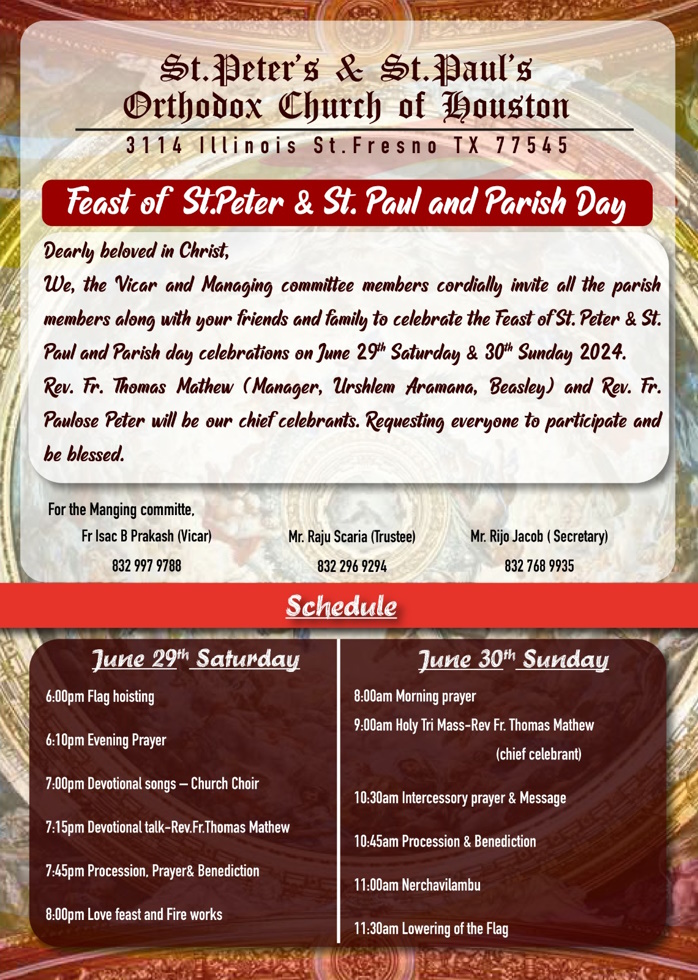 ഹ്യൂസ്റ്റണ്: സെന്റ് പീറ്റേഴ്സ് & സെന്റ് പോൾസ് ഓർത്തഡോക്സ് ഇടവകയിൽ ആണ്ടുതോറും നടത്തിവരുന്ന പെരുന്നാൾ ആഘോഷം ഈ വർഷം ജൂൺ 29, 30 തിയതികളിൽ ഭക്ത്യാദരവോടെ നടത്തപ്പെടുന്നു.