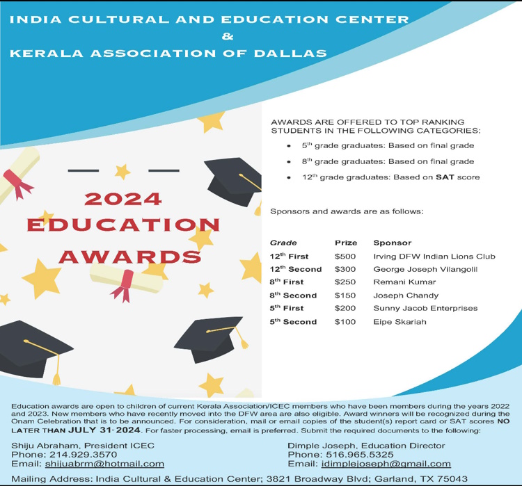 2022, 2023 വർഷങ്ങളിൽ അംഗമായിട്ടുള്ള നിലവിലെ കേരള അസോസിയേഷൻ/ICEC അംഗങ്ങളുടെ കുട്ടികൾക്ക് വിദ്യാഭ്യാസ അവാർഡുകൾ ലഭ്യമാണ്. DFW ഏരിയയിലേക്ക് അടുത്തിടെ മാറിയ പുതിയ അംഗങ്ങൾക്കും അർഹതയുണ്ട്.ഓണാഘോഷ വേളയിൽ അവാർഡ് ജേതാക്കളെ അംഗീകരിക്കും. പരിഗണനയ്ക്കായി, വിദ്യാർത്ഥി(കൾ) റിപ്പോർട്ട് കാർഡിൻ്റെ അല്ലെങ്കിൽ SAT സ്കോറുകളുടെ മെയിൽ അല്ലെങ്കിൽ ഇമെയിൽ പകർപ്പുകൾ 2024 ജൂലൈ 31-ന് മുൻപ് ആവശ്യമായ രേഖകൾ സമർപ്പിക്കുക: