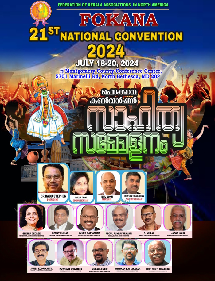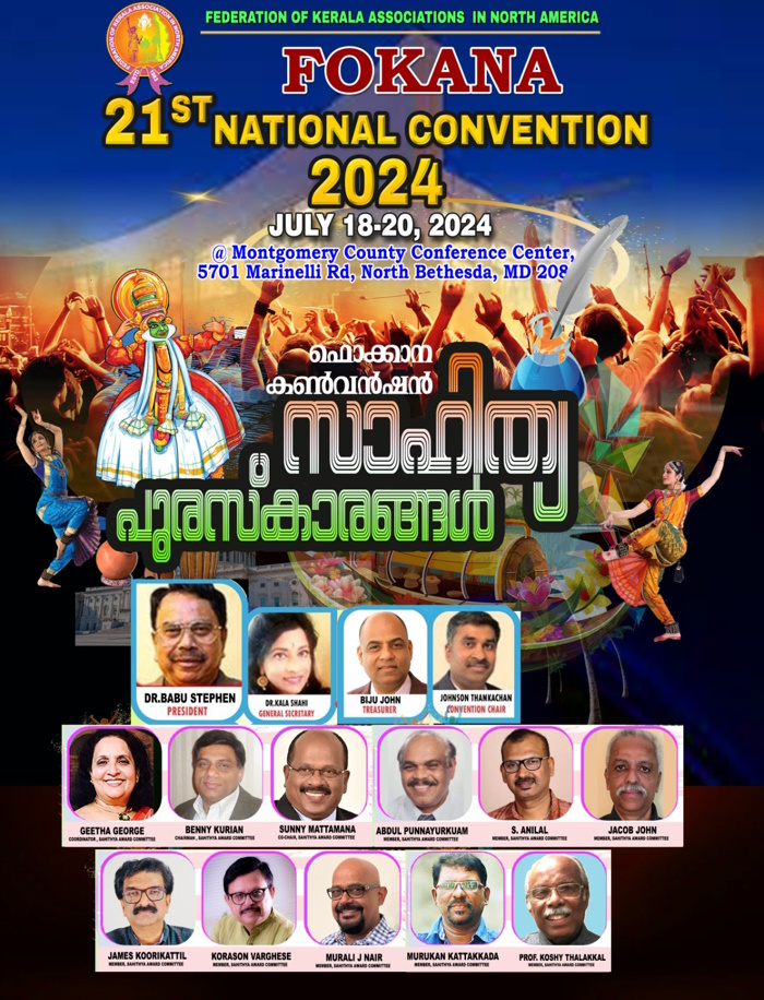 ന്യൂജേഴ്സി: 2024 ജൂലൈ 18 മുതൽ 20 വരെ നോർത്ത് ബെഥെസ്ഡയിലെ മോണ്ട്ഗോമറി കൗണ്ടി കോൺഫറൻസ് സെന്ററിൽ (Bethesda North Marriott Hotel & Conference Center, 5701 Marinelli Rd, Rockville, MD 20852) നടക്കാനിരിക്കുന്ന Federation of Kerala Associations in North America (FOKANA) യുടെ 21-ാമത് ദേശീയ കൺവെൻഷനോടനുബന്ധിച്ചുള്ള സാഹിത്യ സമ്മേളനത്തിൽ വ്യാഴം, വെള്ളി ദിവസങ്ങളിൽ നാല് വിഭാഗങ്ങളിലായി മലയാള സാഹിത്യത്തിലെ വിവിധ മേഖലകളിൽ ഗഹനമായ ചർച്ചകളും സെമിനാറുകളും നടത്തുവാൻ സാഹിത്യസമ്മേളന കമ്മിറ്റി തീരുമാനിച്ചു.