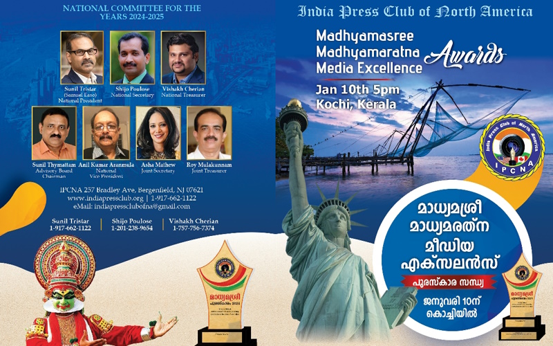 ന്യൂയോർക്ക്: രണ്ടു പതിറ്റാണ്ടിന്റെ നിറവിൽ പത്തു ചാപ്റ്ററുകളുമായി നൂറിലധികം അംഗങ്ങളുടെ പിന്തുണയോടെ മാധ്യമരംഗത്തു നിരവധി സംഭാവനകൾ നൽകി മുന്നേറുന്ന മലയാളി മാധ്യമ പ്രവര്ത്തകരുടെ കൂട്ടായ്മയായ ഇന്ത്യ പ്രസ് ക്ലബ് ഓഫ് നോര്ത്ത് അമേരിക്കയുടെ മാധ്യമശ്രീ, മാധ്യമരത്ന പുരസ്കാര വേദിയാകാൻ കൊച്ചി ഒരുങ്ങുന്നു. മാധ്യമ രംഗത്തെ സമഗ്ര സംഭാവനകള്ക്ക് നല്കുന്ന ഈ പുരസ്കാര ചടങ്ങു് 2024 ജനുവരി 10 വെള്ളിയാഴ്ച ആറു മണിക്ക് കൊച്ചിയിൽ നടക്കുന്നതാണ്. സാമൂഹിക-സാംസ്കാരിക-രാഷ്ട്രീയ-മാധ്യമ രംഗത്തെ പ്രമുഖർ പങ്കെടുക്കുന്ന വര്ണ്ണാഭമായ ചടങ്ങില് പുരസ്ക്കാരങ്ങള് വിതരണം ചെയ്യും.