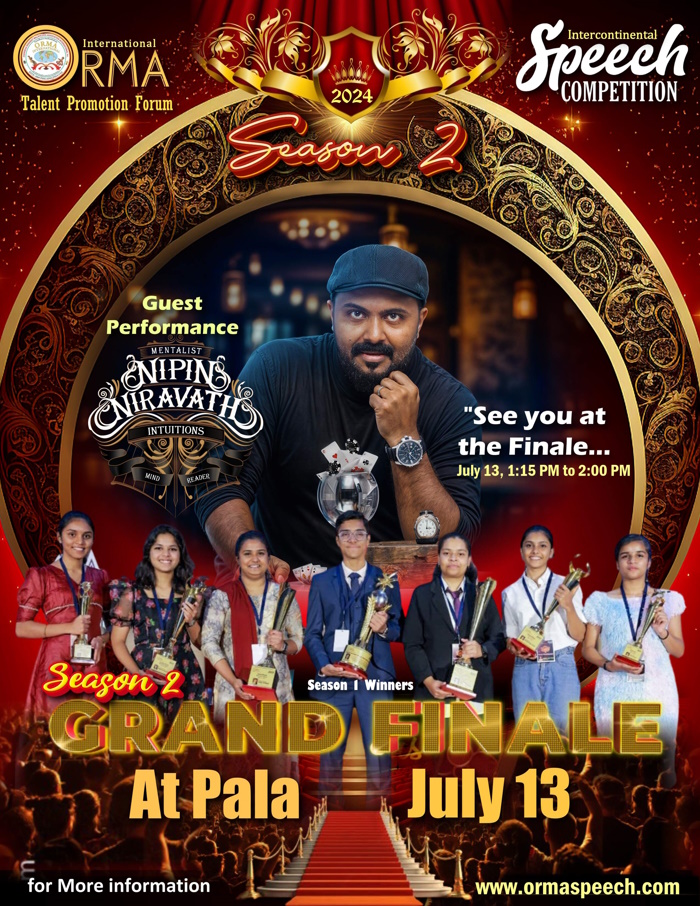 ഓര്മ്മ ഇന്റര്നാഷണല് (ഓവര്സീസ് റസിഡന്റ് മലയാളീസ് അസോസിയേഷന്) ടാലന്റ് പ്രൊമോഷന് ഫോറം സംഘടിപ്പിക്കുന്ന ഇന്റര്നാഷണല് പ്രസംഗമത്സരം സീസണ് ടു വിജയകരമായ മൂന്നു ഘട്ടങ്ങളും പൂര്ത്തിയാക്കി ഗ്രാന്ഡ് ഫിനാലേയിലേക്ക് കടക്കുന്നു. ജൂലൈ 12, 13 തീയതികളില് പാലായിലെ സെന്റ് തോമസ് കോളേജ് ഇന്റഗ്രേറ്റഡ് സ്പോര്ട്സ് കോംപ്ലക്സ് ഓഡിറ്റോറിയത്തില് വെച്ചാണ് ഗ്രാന്ഡ് ഫിനാലെ നടക്കുന്നത്. ലോകസഞ്ചാരിയും അതേസമയം തന്നെ പ്രസാധകനും വ്യവസായിയും മാധ്യമ പ്രവര്ത്തകനും കൂടിയായ സന്തോഷ് ജോര്ജ് കുളങ്ങര ഗ്രാന്ഡ് ഫിനാലേ ഉദ്ഘാടനം ചെയ്യും.