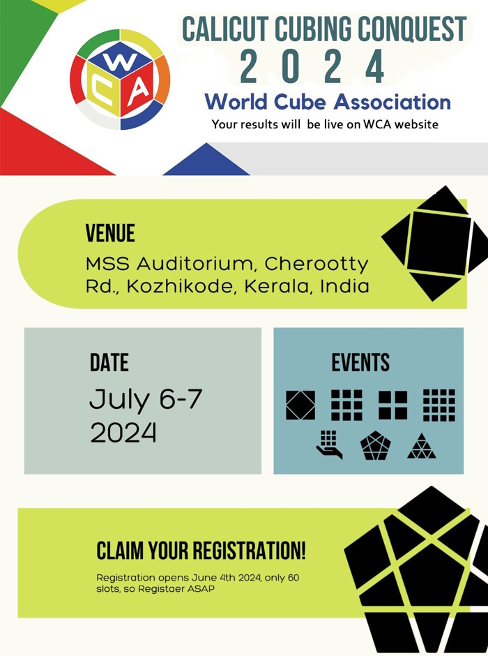 WCA സംഘടിപ്പിക്കുന്ന കാലിക്കറ്റ് ക്യൂബിംഗ് കോൺക്വസ്റ്റ് 2024, ഈ വരുന്ന ജൂലൈ 6-7 തീയതികളിൽ കോഴിക്കോട് ചെറൂട്ടി റോഡിലുള്ള എം.എസ്.എസ് ഓഡിറ്റോറിയത്തിൽ നടക്കും.