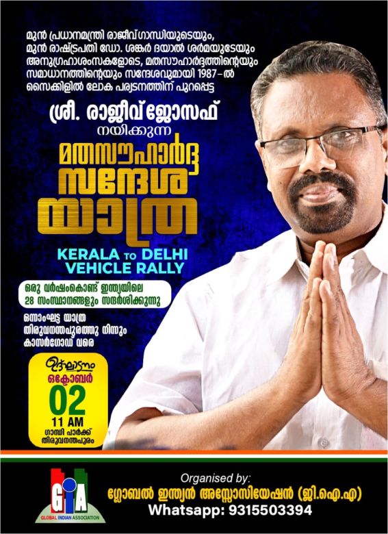 ന്യൂഡൽഹി: ഗ്ലോബൽ ഇന്ത്യൻ അസ്സോസിയേഷൻ പ്രസിഡന്റ് രാജീവ് ജോസഫിന്റെ നേതൃത്വത്തിൽ ഗാന്ധി ജയന്തി ദിനമായ ഒക്ടോബർ രണ്ടിന് മതസൗഹാർദ്ദ സന്ദേശയാത്ര ആരംഭിക്കുന്നു. കേരളത്തിൽ നിന്നും ഡൽഹിവരെയാണ് യാത്ര സംഘടിപ്പിക്കുന്നത്. ഒരു വർഷം നീണ്ടു നിൽക്കുന്ന ഈ യാത്രയിൽ, രാജ്യത്തെ 28 സംസ്ഥാനങ്ങളിലും കേന്ദ്ര ഭരണപ്രദേശങ്ങളിലും, മതസൗഹാർദ്ദത്തിന്റെയും, സഹോദര്യത്തിന്റെയും, സമാധാനത്തിന്റെയും സന്ദേശം പ്രചരിപ്പിക്കുന്നതിനോടൊപ്പം, രാജ്യത്തിന്റെ ഐക്യത്തിനും, അഖണ്ഡതക്കും, മതസൗഹാർദ്ദത്തിനും വേണ്ടി സ്തുത്യർഹമായ സേവന പ്രവർത്തനങ്ങൾ കാഴ്ചവെക്കുന്ന ആയിരക്കണക്കിന് പൊതുപ്രവർത്തകരെയും പ്രതിഭകളെയും യാത്രാമദ്ധ്യേ ആദരിക്കും.