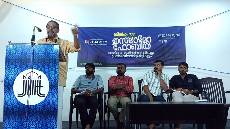മലപ്പുറം: ഇസ്ലാമോഫോബിയ: വംശീയ വെറുപ്പിന്റെ യുക്തികളും പ്രതിരോധത്തിൻ്റെ വഴികളും എന്ന തലകെട്ടിൽ സോളിഡാരിറ്റി ജില്ലാ കമ്മിറ്റി ശില്പശാല സംഘടിപ്പിച്ചു.മലപ്പുറം മലബാർ ഹൗസിൽ നടന്ന ശില്പശാലയിൽ സജീദ് ഖാലിദ്, വാഹിദ് ചുള്ളിപ്പാറ, ഡോ. സാദിഖ്. പി. കെ എന്നിവർ വിവിധ സെഷനുകളിൽ സംസാരിച്ചു.. ജില്ലാ വൈസ് പ്രസിഡന്റ് അജ്മൽ. കെ.പി അധ്യക്ഷത വഹിച്ചു..ജില്ലാ ജനറൽ സെക്രട്ടറി അജ്മൽ. കെ. എൻ സ്വാഗതവും സാബിക് വെട്ടം സമാപനവും നിർവഹിച്ചു