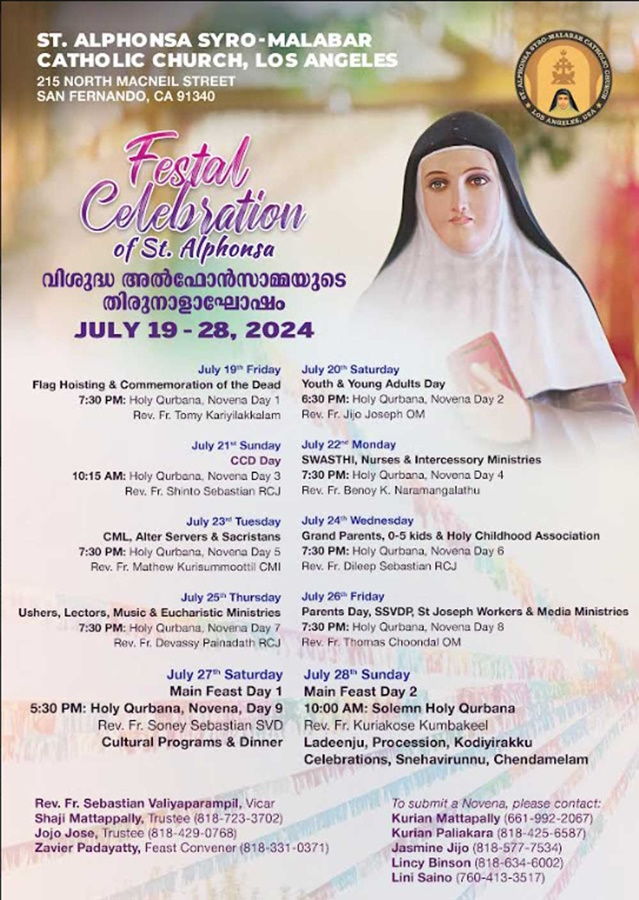 ലോസ് ആഞ്ചലസ് :വിശുദ്ധ അൽഫോൻസാമ്മയുടെ നാമധേയത്തിലുള്ള ലോസ് ആഞ്ചലസ് സെന്റ് അൽഫോൻസ സീറോ മലബാർ ദേവാലയത്തിൽ വിശുദ്ധയുടെ തിരുനാൾ ജൂലൈ 19 മുതൽ 28 വരെ ഭക്ത്യാദരപൂർവ്വം കൊണ്ടാടുകയാണ്. ജൂലൈ 19 ന് റെവ. ഫാ. ടോമി കരിയിലക്കുളത്തിന്റെ മുഖ്യകാർമികത്വത്തിൽ വിശുദ്ധ കുർബാനയും നൊവേനയും അർപ്പിക്കപ്പെടും. അതിനുശേഷം തിരുനാളിന്റെ കൊടിയേറ്റം. തുടർന്നുള്ള ദിവസങ്ങളിൽ വിശുദ്ധ കുർബാനയും ഉദ്ദിഷ്ടകാര്യങ്ങൾക്കായുള്ള നൊവേനയും ഉണ്ടായിരിക്കുന്നതാണ്.