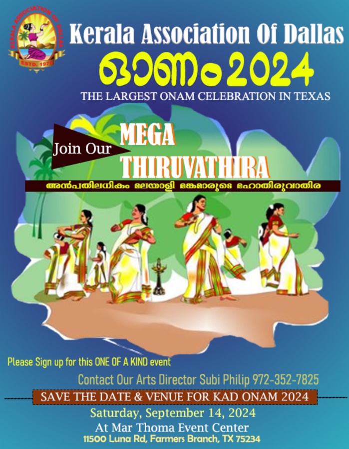 ഡാളസ് :കേരള അസോസിയേഷൻ ഓഫ് ഡാളസ് സെപ്തംബർ 14 ന് സംഘടിപ്പിക്കുന്ന ഈ വർഷത്തെ ഓണാഘോഷങ്ങളുടെ ഭാഗമായി ഒരു മെഗാ തിരുവാതിര പ്രകടനം സംഘടിപ്പിക്കാൻ ഒരുങ്ങുന്നു. 50-ലധികം പേർ പങ്കെടുക്കുന്ന (സ്ത്രീകൾ) മനോഹരമായ തിരുവാതിര പ്രകടനം ഏകോപിപ്പിക്കാൻ ശ്രമിക്കുന്നു.