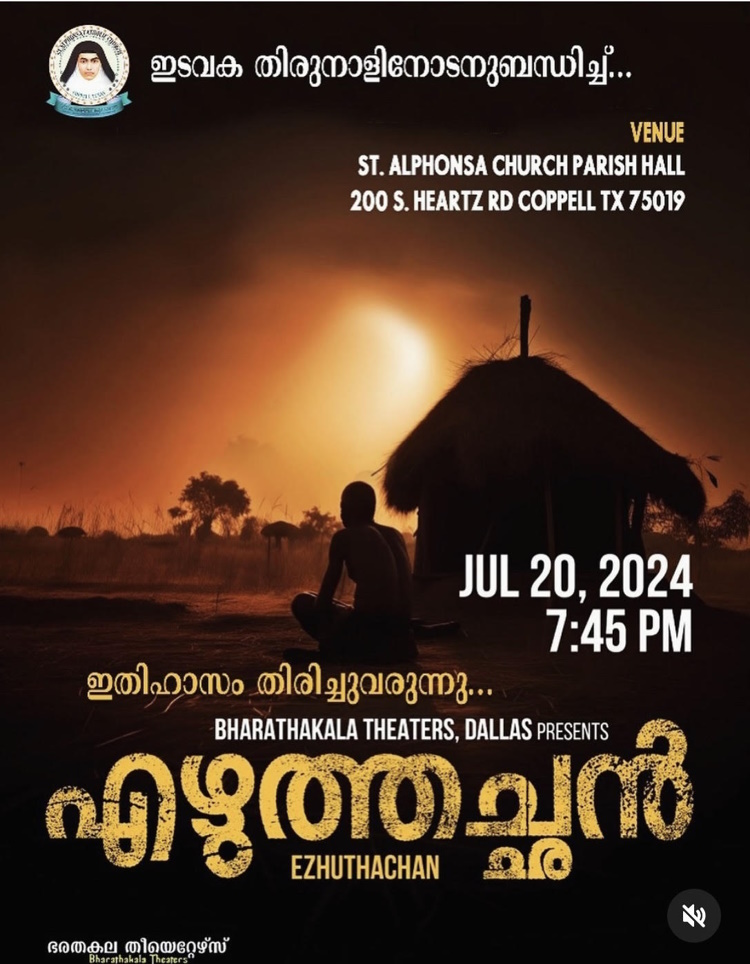 ഡാളസ്: മലയാള ഭാഷയുടെ പിതാവെന്ന് വിശേഷിപ്പിക്കപ്പെടുന്ന തുഞ്ചത്തെഴുത്തച്ഛനെ വിഷയമാക്കിയുള്ള നാടകം ‘എഴുത്തച്ഛൻ’ ശനിയാഴ്ച (ജൂലൈ 20) വൈകുന്നേരം 7:30 നു കൊപ്പേൽ സെന്റ് അൽഫോൻസാ ഓഡിറ്റോറിയത്തിൽ (200 S Heartz Rd, Coppell, TX 75019) അരങ്ങേറും. സെന്റ് അൽഫോൻസാ സീറോ മലബാർ ദേവാലയത്തിന്റെ തിരുനാളിനോടനുബന്ധിച്ചുള്ള കലാപരിപാടികളുടെ ഭാഗമായാണ് നാടകം. ജൂലൈ 19 മുതൽ 29 വരെയാണ് തിരുനാൾ.