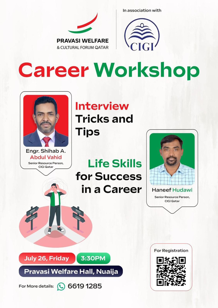 ‘തൊഴിൽ മേഖലകളിലെ വിജയത്തിനുള്ള നൈപുണ്യങ്ങള്’, ‘ഇന്റര്വ്യൂ എങ്ങനെ അഭിമുഖീകരിക്കാം’ എന്നീ വിഷയങ്ങളെ അധികരിച്ച് സി.ജി ഖത്തര് സീനിയര് റിസോഴ്സ് പേര്സണ്മാരായ ഹനീഫ് ഹുദവി, എഞ്ചിനിയര് ഷിഹാബ് അബ്ദുല് വാഹിദ് എന്നിവര് ശില്പശാലക്ക് നേതൃത്വം നല്കും.