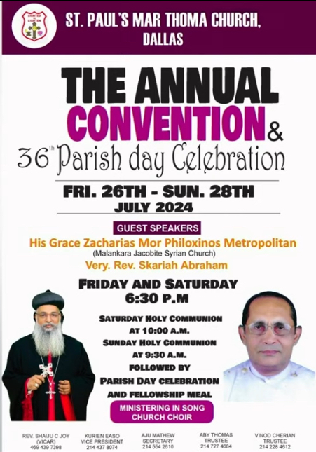ഡാളസ് :സെൻറ്  പോൾസ് മാർത്തോമ്മാ ചർച്ച്, ഡാളസ് വാർഷിക കൺവെൻഷനും  (വെള്ളിയും ശനിയാഴ്ചയും 6:30 P.M ) 36-മത്  ഇടവക ദിന ആഘോഷവും ജൂലൈ 26 മുതൽ  28 വരെ നടക്കുന്നതാണ്.മലങ്കര യാക്കോബായ സുറിയാനി സഭ അഭിവന്ദ്യ സഖറിയാസ് മോർ ഫിലോക്സിനോസ് മെത്രാപ്പോലീത്തയാണ്  മുഖ്യാഥിതി