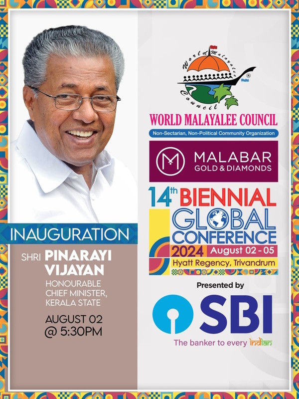 തിരുവനന്തപുരം: വേള്ഡ് മലയാളി കൗണ്സിലിന്റെ നേതൃത്വത്തിൽ തിരുവനന്തപുരത്ത് നടക്കുന്ന പതിനാലാമത് ബയനിയല് ഗ്ലോബൽ കോണ്ഫറന്സിനുള്ള ഒരുക്കങ്ങൾ പുരോഗമിക്കുന്നതായി ജനറൽ സെക്രട്ടറി പിന്റൊ കണ്ണംപള്ളി അറിയിച്ചു. ഓഗസ്റ്റ് 2 മുതല് 5 വരെ തിരുവനന്തപുരം ഹയാത്ത് റീജന്സി ഹോട്ടലിലാണ് കോൺഫറൻസ് നടക്കുക. മലബാർ ഗോൾഡും സ്റ്റേറ്റ് ബാങ്ക് ഓഫ് ഇന്ത്യ യും പ്രധാന സ്പോൺസർസായ ഈതവണത്തെ കോൺഫറൻസ് കേരള മുഖ്യ മന്ത്രി ബഹു. ശ്രി പിണറായി വിജയൻ ഉത്കാടനം ചെയ്യുമെന്ന് ചെയർമാൻ ഗോപാല പിള്ളയും പ്രസിഡന്റ് ജോൺ മത്തായിയും സംയുക്തമായി അറിയിച്ചു. കോൺഫറൻസ് കമ്മിറ്റി ചെയർപേഴ്സൺ Dr K G വിജയലക്ഷ്മി, ജനറൽ കൺവീനർ Dr P M നായർ IPS (retd) മറ്റെല്ലാ കമ്മിറ്റി മെമ്പേഴ്സിന്റെയും അശ്രാന്ത പരിശ്രമം സമ്മേളനത്തിന്റെ വിജയമുറപ്പിക്കുമെന്നു WMC ഗ്ലോബൽ കൌൺസിൽ അഭിപ്രായപ്പെട്ടു.