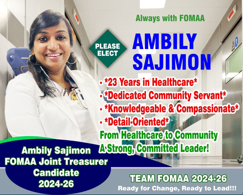 അമ്പിളി സജിമോൻ, 23 വർഷത്തെ നേഴ്സിങ് സേവനത്തിന്റെ ഇടയിൽ തന്റെ കഠിനാദ്വനം കൊണ്ട് പല പ്രൊമോഷൻസ് കിട്ടുകയും, ഡെയ്സി അവാർഡ് വരെ നേടുകയും ചെയ്തുട്ടുണ്ട്. കുടുംബമായാലും പള്ളിയാണെങ്കിലും, സാമുദായിക സംഘടനകളിനാണെങ്കിലും സന്തോഷത്തോടെ സേവനം ചെയുന്ന അമ്പിളി സജിമോൻ തീർച്ചയായും ഫോമയ്ക്കു ഒരു മുതൽക്കൂട്ട് ആയിരിക്കുമെന്നും ഫോമായേ ഉയരങ്ങളിലേക്ക് ഉയർത്താൻ കഴിവുള്ള നേതാവാണെന്നും സൗത്ത് ഈസ്റ്റ് റീജിയന്റെ മുൻ വൈസ് പ്രസിഡന്റ് തോമസ് ഈപ്പൻ, ഫോമയുടെ മുൻ നാഷണൽ കൌൺസിൽ മെംബേർസ് പ്രകാസും, ജെയിംസും അഭിപ്രായപ്പെട്ടു.
