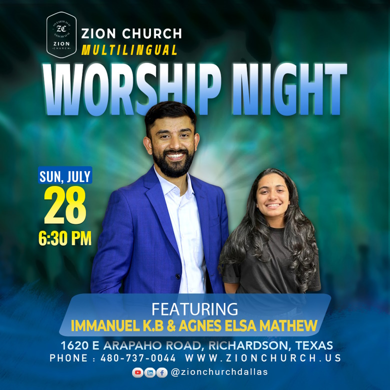 ഡാളസ്: ഡാലസിലെ റിച്ചാര്ഡ്സണ് സിറ്റിയില് സയണ് ചര്ച്ചില് വച്ച് ജൂലൈ 28 ഞായറാഴ്ച വൈകിട്ട് 6:30ന് സംഗീത ആരാധന നടത്തപ്പെടുന്നു. സുപ്രസിദ്ധ ഗായകനായ ഇമ്മാനുവല് കെ. ബി. യുടെ നേതൃത്വത്തില് നടക്കുന്ന ഈ വര്ഷിപ്പ് നൈറ്റില് അനുഗ്രഹീത ഗായിക ആഗ്നസ് എല്സി മാത്യുവും ഗാനങ്ങള് ആലപിക്കുന്നതാണ്. ഈ മീറ്റിംഗിലേക്ക് എല്ലാവരെയും സ്വാഗതം ചെയ്യുന്നു.