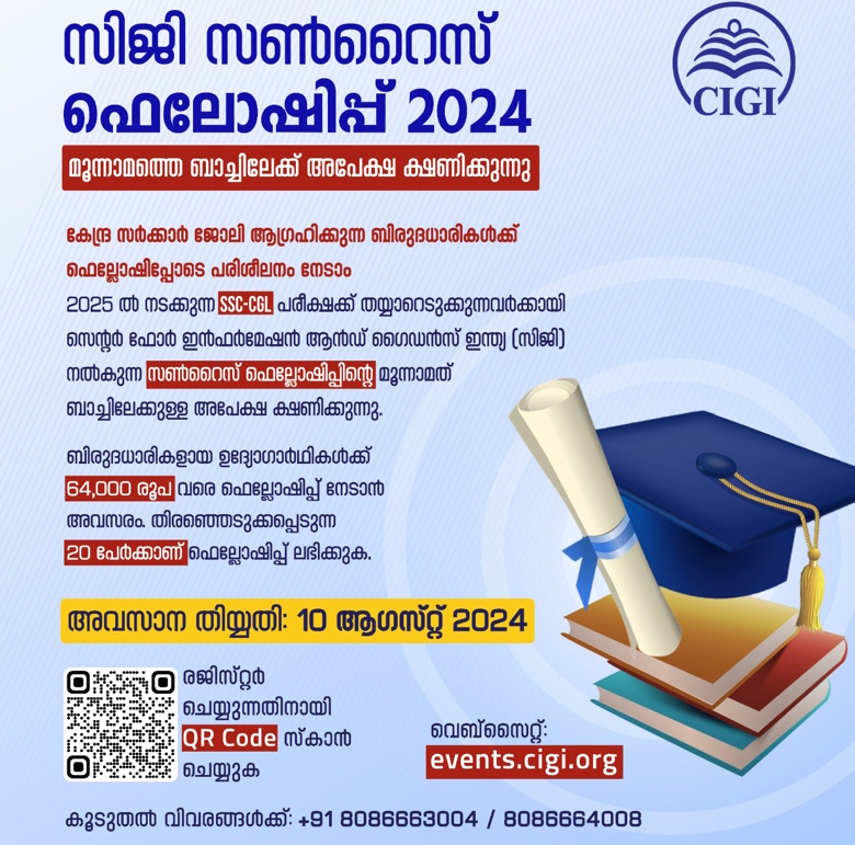 2025 ൽ SSC നടത്തുന്ന CGL (COMBINED GRADUATE LEVEL) പരീക്ഷക്ക് തയ്യാറെടുക്കുന്നവർക്കായി സെന്റർ ഫോർ ഇൻഫർമേഷൻ ആൻഡ് ഗൈഡൻസ് ഇന്ത്യ (സിജി) ഒരുക്കുന്ന സൺറൈസ് ഫെല്ലോഷിപ്പിന്റെ മൂന്നാമത്തെ ബാച്ചാണിത്.