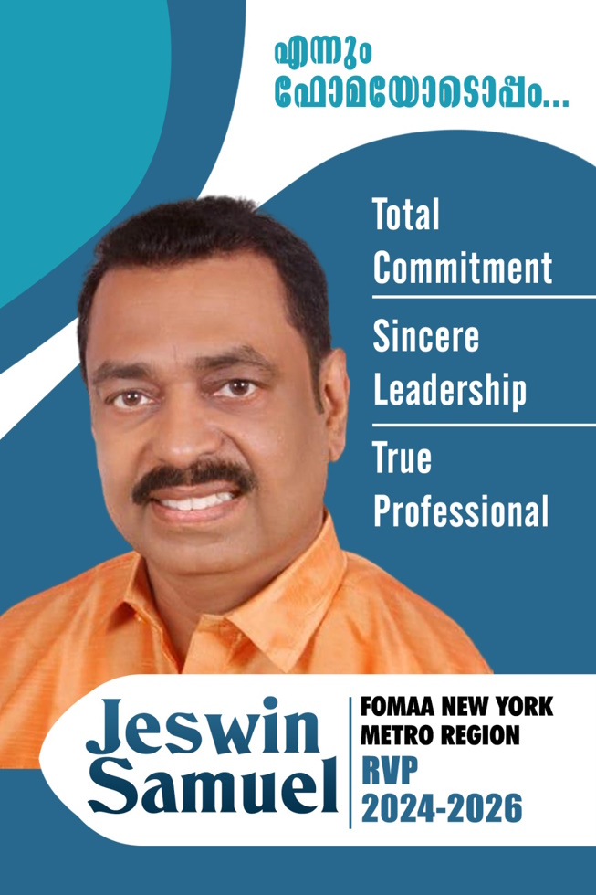 തികച്ചും സൗമ്യനും മിതഭാഷിയുമായ ജെസ്വിൻ നല്ലൊരു പ്രാസംഗികനും സംഘാടകനുമാണ്. ഉന്നത വിദ്യാഭ്യാസവും നേതൃത്വ പാടവും സഹായമനസ്കതയും എല്ലാവരോടും സ്നേഹപൂർവ്വം ഇടപെടുവാൻ കഴിവുമുള്ളതിനാൽ ന്യൂയോർക്ക് മെട്രോ റീജിയൻറെ വൈസ് പ്രസിഡൻറ് ആയി ഫോമായേ ഉന്നതികളിലേക്കു എത്തിക്കുവാൻ ജെസ്വിന് നിഷ്പ്രയാസം സാധിക്കും എന്നതിലൊട്ടും സംശയം വേണ്ടാ. ആയതിനാൽ ന്യൂയോർക്ക് മെട്രോ റീജിയണിലുള്ള എല്ലാ അംഗ സംഘടനാ പ്രതിനിധികളോടും ജെസ്വിനെ വോട്ട് ചെയ്ത് വിജയിപ്പിക്കണമെന്ന് അഭ്യർത്ഥിക്കുന്നു.