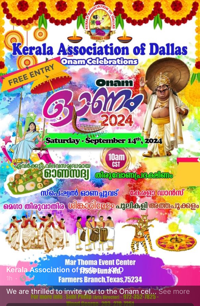 ഡാളസ് കേരള അസോസിയേഷൻ ഓഫ് ഡാളസിൻ്റെ ആഭിമുഖ്യത്തിൽ നടക്കുന്ന ഓണാഘോഷങ്ങൾ : സെപ്റ്റംബർ 14, 2024, ശനിയാഴ്ച രാവിലെ 10:00 മുതൽ മാർത്തോമ്മാ ഇവൻ്റ് സെൻ്റർ, 11550 ലൂണ റോഡ്, ഫാർമേഴ്സ് ബ്രാഞ്ച്, TX, 75234 സംഘടിപ്പിക്കുന്നു