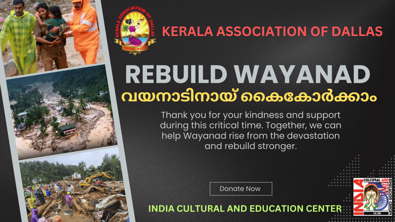 ഡാളസ് : വയനാട്ടിൽ അടുത്തിടെയുണ്ടായ പ്രകൃതി ദുരന്തത്തിൻ്റെ ഫലമായി ദുരിതമനുഭവിക്കുന്നവർക് കേരള അസോസിയേഷൻ ഓഫ് ഡാളസ് ഇൻ അസോസിയേഷൻ വിത്ത് ഇന്ത്യ കൾച്ചറൽ ആൻഡ് എജ്യുക്കേഷൻ സെൻ്റർ (ഐസിഇസി) ധനസമാഹരണം ആരംഭിക്കുന്നു. ഗുണഭോക്താക്കൾക്ക് നേരിട്ടോ അവരെ സഹായിക്കാൻ നേരിട്ട് പ്രവർത്തിക്കുന്ന സംഘടനകൾ മുഖേനയോ സഹായം നൽകാനാണു തീരുമാനം . ദുരിതബാധിതർക്ക് അടിയന്തര സഹായം നൽകുന്നതിനായി ഒരു GoFundMe കാമ്പെയ്ൻ സൃഷ്ടിച്ചിട്ടുണ്ട്. പാർപ്പിടം, ഭക്ഷണം, വൈദ്യസഹായം, മറ്റ് സുപ്രധാന ആവശ്യങ്ങൾ എന്നിവ വാഗ്ദാനം ചെയ്യുന്ന നിങ്ങളുടെ സംഭാവനയ്ക്ക് അവരുടെ ജീവിതത്തിൽ വ്യക്തമായ മാറ്റമുണ്ടാക്കാൻ കഴിയുമെന്നു സംഘാടകർ പ്രതീക്ഷിക്കുന്നു