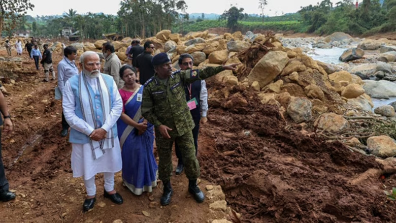 ഇന്ന് (ശനിയാഴ്ച) ഉരുൾപൊട്ടലില് നാശം വിതച്ച വയനാട്ടില് പ്രധാനമന്ത്രി നരേന്ദ്ര മോദി എത്തി. കേരള ഗവർണർ ആരിഫ് മുഹമ്മദ് ഖാൻ, മുഖ്യമന്ത്രി പിണറായി വിജയൻ, കേന്ദ്രമന്ത്രി സുരേഷ് ഗോപി എന്നിവർക്കൊപ്പം പ്രധാനമന്ത്രി മോദി ദുരിതബാധിത പ്രദേശങ്ങളിലൂടെ നടന്ന് സ്ഥിതിഗതികള് വിലയിരുത്തി. ഉരുൾപൊട്ടൽ മേഖലയുടെ വിശദമായ ഭൂപടം ഉദ്യോഗസ്ഥർ അദ്ദേഹത്തിന് മുന്നിൽ അവതരിപ്പിച്ചുകൊണ്ട് ദുരന്തത്തിൻ്റെ ആഘാതത്തെക്കുറിച്ചും ഒഴിപ്പിക്കൽ പ്രവർത്തനങ്ങളെക്കുറിച്ചും വിശദീകരിച്ചു.
