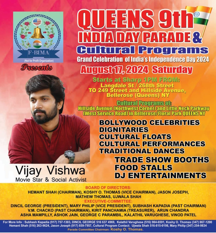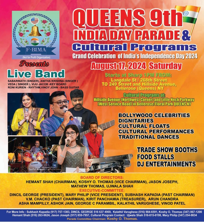 ന്യൂയോർക്ക്: ഫ്ലോറൽപാർക്ക്-ബല്ലെറോസ് ഇന്ത്യൻ മെർച്ചൻറ്സ് അസ്സോസ്സിയേഷൻ (F-BIMA) കഴിഞ്ഞ എട്ട് വർഷമായി ഇന്ത്യൻ സ്വാതന്ത്ര്യ ദിനത്തോടനുബന്ധിച്ച് നടത്തിവരുന്ന ഇന്ത്യാ ഡേ പരേഡിന്റെ ഒമ്പതാമത് പരേഡ് ഈ മാസം 17 ശനിയാഴ്ച ഉച്ചക്ക് 1 മണി മുതൽ നടത്തപ്പെടുന്നു. ഫ്ലോറൽപാർക്കിലെ ഹിൽസൈഡ് അവന്യൂ റോഡിൽ ലാങ്ഡെയിൽ സ്ട്രീറ്റ് (268th Street) മുതൽ 249 സ്ട്രീറ്റ് വരെയാണ് പരേഡ് നടത്തപ്പെടുന്നത്. ഒമ്പതാമത് ഇന്ത്യ ഡേ പരേഡിനുള്ള ഒരുക്കങ്ങളെല്ലാം പൂർത്തി ആയതായി പരേഡ് കമ്മറ്റി ചെയർമാൻ ഹേമന്ത് ഷാ, വൈസ് ചെയർമാൻ കോശി തോമസ്, F-BIMA പ്രസിഡൻറ് ഡിൻസിൽ ജോർജ്, വൈസ് പ്രസിഡൻറ് മേരി ഫിലിപ്പ് എന്നിവർ സംയുക്തമായി പ്രസ്താവിച്ചു.
