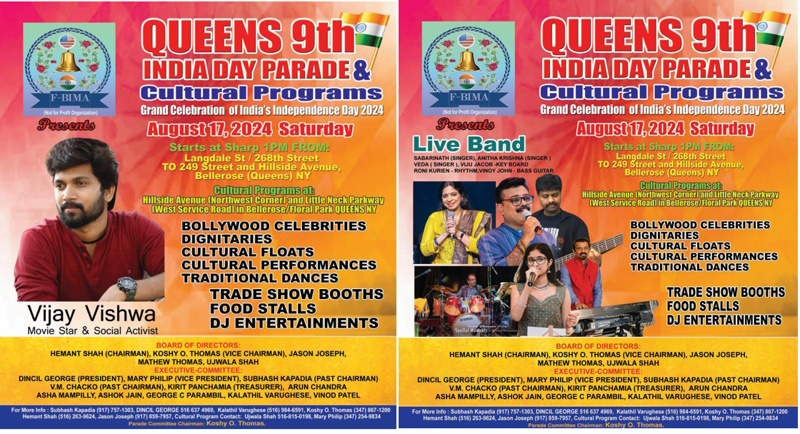 ന്യൂയോർക്ക്: ഫ്ലോറൽ പാർക്ക്-ബെല്ലറോസ് ഇന്ത്യൻ മെർച്ചൻറ്സ് അസ്സോസിയേഷൻറെ (F-BIMA) ആഭിമുഖ്യത്തിൽ 17 ശനിയാഴ്ച (നാളെ) നടക്കുന്ന ഒൻപതാമത് ക്വീൻസ് ഇന്ത്യാ ഡേ പരേഡിനുള്ള ഒരുക്കങ്ങളെല്ലാം പൂർത്തി ആയതായി ഡയറക്ടർ ബോർഡ് വൈസ് ചെയർമാൻ കോശി ഓ. തോമസ് ഫ്ലോറൽപാർക്കിൽ പ്രസ്താവിച്ചു.