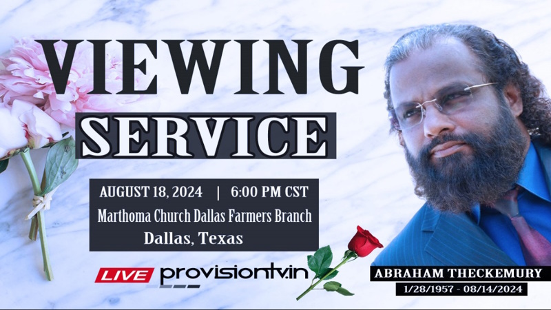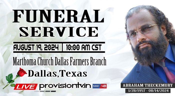 സംസ്കാര ശുശ്രൂഷ : തീയതി: തിങ്കൾ: 08/19/2024 AM: 08/19/2020. ചർച്ച് ഡാളസ് ഫാർമേഴ്സ് ബ്രാഞ്ച് 11550 ലൂണ റോഡ് ഡാളസ് TX 75234