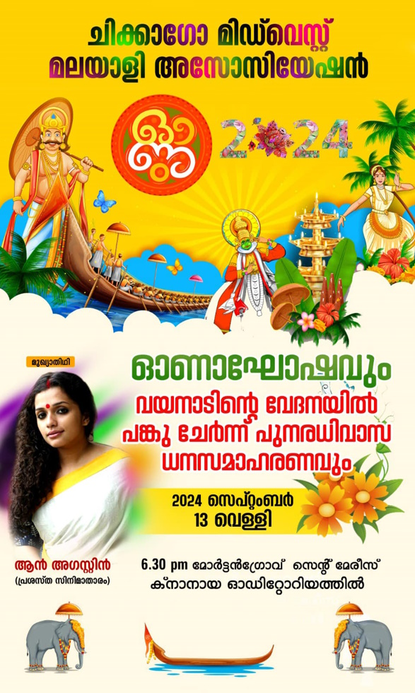പ്രശസ്ത സിനിമാതാരം ആന് അഗസ്റ്റിന് ചടങ്ങില് മുഖ്യാത്ഥിയായിരിക്കും. ഓണാഘോഷത്തോടൊപ്പം തന്നെ വയനാടിന്റെ വേദനയില് പങ്കുചേരുകയും പുനരധിവാസത്തിനു വേണ്ടിയുള്ള ധനസമാഹരണവും നടത്തുമെന്ന് പ്രസിഡന്റ് റോയി നെടുംചിറ അറിയിച്ചു.