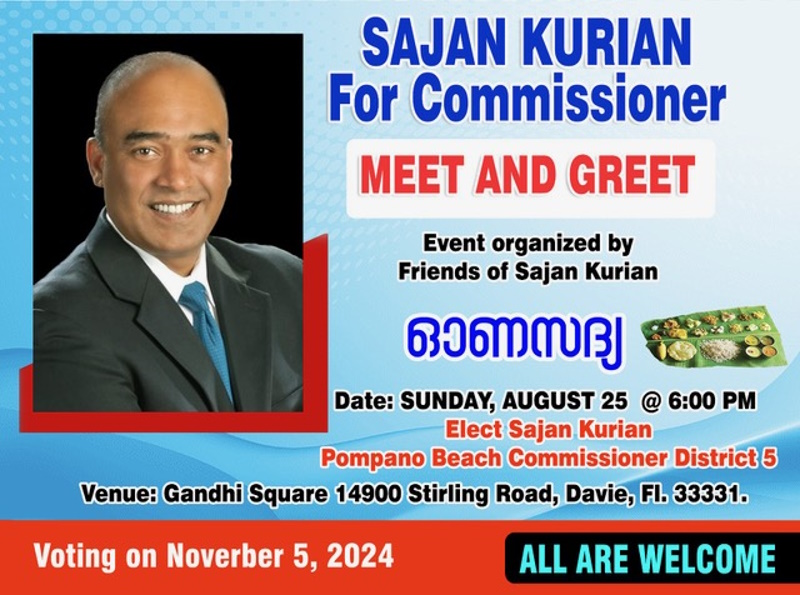 ഡേവി (ഫ്ലോറിഡ): സൗത്ത് ഫ്ലോറിഡ മലയാളികള്ക്കിടയില് പ്രമുഖനായ ഡോ. സാജൻ കുര്യൻ പാമ്പനോ ബീച്ച് സിറ്റി കമ്മീഷണര് സ്ഥാനത്തേക്ക് മത്സരിക്കുന്നു. നവംബർ 5-നുള്ള പൊതു തെരഞ്ഞെടുപ്പിലാണ് സാജൻ മറ്റു രണ്ടു സ്ഥാനാർഥികളോടൊപ്പം വാശിയേരിയ ഈ തെരഞ്ഞെടുപ്പിൽ മാറ്റുരക്കുന്നത്.