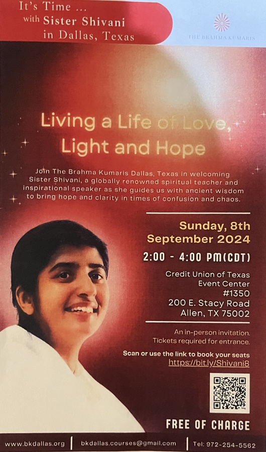 ആശയക്കുഴപ്പത്തിൻ്റെയും അരാജകത്വത്തിൻ്റെയും സമയങ്ങളിൽ പ്രത്യാശയും വ്യക്തതയും കൊണ്ടുവരാൻ പ്രാചീന ജ്ഞാനത്താൽ നമ്മെ നയിക്കുന്ന, ആഗോളതലത്തിൽ അറിയപ്പെടുന്ന ആത്മീയ അധ്യാപികയും പ്രചോദനാത്മക പ്രഭാഷകയുമായ സിസ്റ്റർ ശിവാനിയെ സ്വാഗതം ചെയ്യാൻ ടെക്സാസിലെ ബ്രഹ്മാ കുമാരിസ് മെഡിറ്റേഷൻ സെന്ററാണ് പരിപാടികൾ തയാറാകുന്നത് .