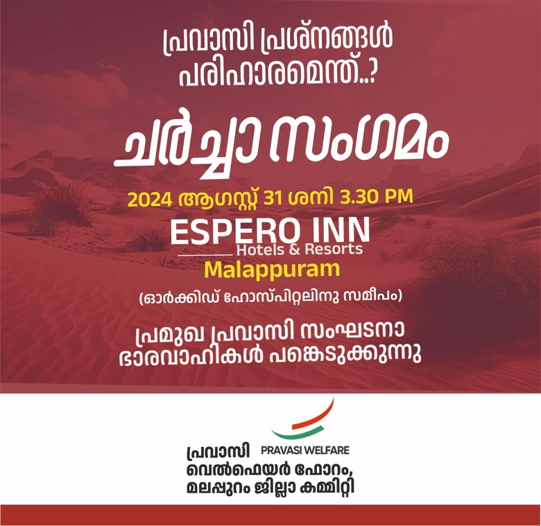 ഓഗസ്റ്റ് 31 ശനിയാഴ്ച വൈകുന്നേരം 3.30ന് മലപ്പുറം കിഴക്കെതല എസ്പെരോ ഇൻ ഹോട്ടലിൽ ‘പ്രവാസി പ്രശ്നങ്ങൾക്ക് പരിഹാരമെന്ത്?’ എന്ന ശീർഷകത്തിൽ ആണ് ചർച്ചാസംഗമം. വെൽഫെയർ പാർട്ടി ജില്ലാ പ്രസിഡൻ്റ് നാസർ കീഴുപറമ്പ് സംഗമം ഉദ്ഘാടനം ചെയ്യും. പ്രവാസി ആർട്ടിസ്റ്റ് ഉസ്മാൻ ഇരുമ്പുഴി, കേരള പ്രവാസി സംഘം ജില്ലാ സെക്രട്ടറി വി കെ അബ്ദുൽ റഊഫ്, പ്രവാസി ലീഗ് ജില്ലാ പ്രസിഡൻ്റ് കുഞ്ഞാലി ഹാജി, കേരള പ്രദേശ് പ്രവാസി കോൺഗ്രസ് ജില്ലാ പ്രസിഡൻ്റ് പികെ കുഞ്ഞു ഹാജി, പീപ്പിൾസ് കൾച്ചറൽ ഫോറം ജില്ലാ സെക്രട്ടറി ശിഹാബ് വേങ്ങര, പ്രവാസി ഫെഡറേഷൻ ജില്ലാ ജനറൽ സെക്രട്ടറി നാസർ ഡെബോണ, പ്രവാസി എഴുത്തുകാരൻ ഉമ്മർ കോയ എം, പിസിഎഫ് ജില്ലാ വെൽഫെയർ ബോർഡ് ചെയർമാൻ ഷാഹിർ മൊറയൂർ തുടങ്ങിയവർ ചർച്ചയിൽ പങ്കെടുക്കും.
