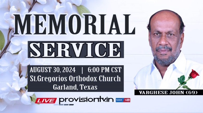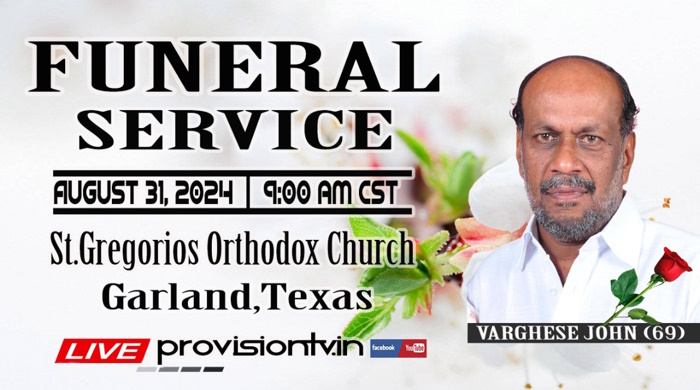 ഗാർലാൻഡ് (ഡാളസ്): ഡാളസിൽ അന്തരിച്ച വർഗീസ് ജോണിൻ്റെ (ബേബി) സംസ്കാര ശുശ്രൂഷയും പൊതു ദര്ശനവും ഓഗസ്റ്റ് 30,31 തീയതികളിൽ ഗാർലൻഡ് സെൻ്റ് ഗ്രിഗോറിയോസ് ഓർത്തഡോക്സ് പള്ളിയിൽ നടക്കും.