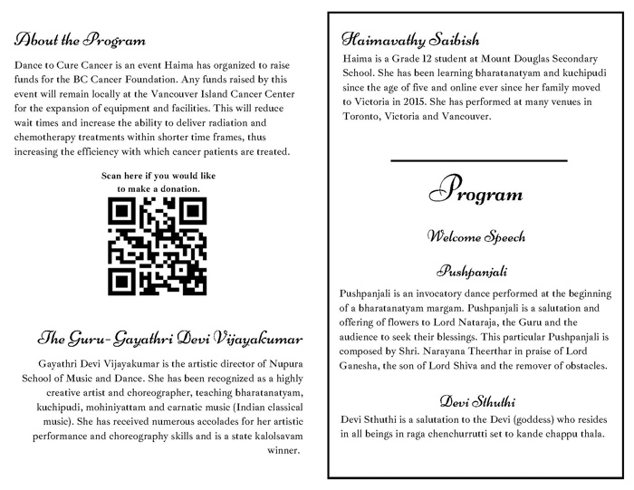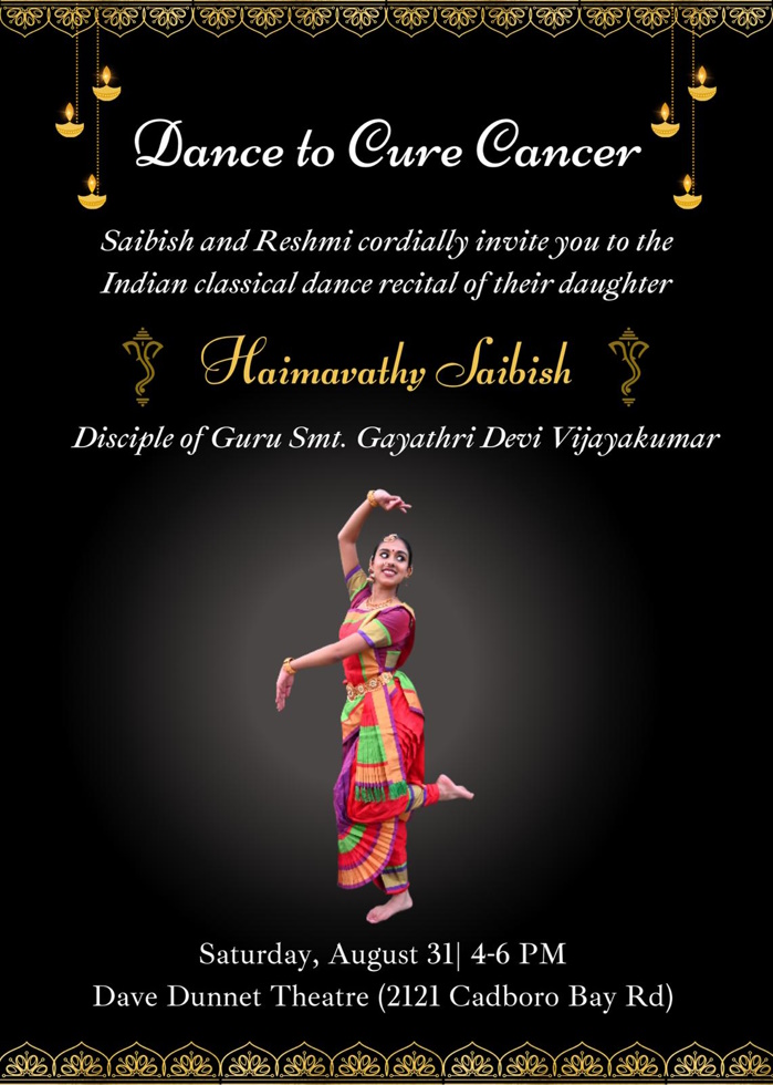 വിക്ടോറിയ, ബിസി: ഗ്രേഡ് 12 വിദ്യാർത്ഥിനിയായ ഹൈമ സൈബീഷ്, ഓഗസ്റ്റ് 31 ശനിയാഴ്ച്ച, ഡേവ് ഡണറ്റ് കമ്മ്യൂണിറ്റി തിയേറ്ററിൽ ബിസി കാൻസർ ഫൗണ്ടേഷന്റെ ധനശേഖരണാർത്ഥം “ഡാൻസ് ടു ക്യൂർ ക്യാൻസർ” എന്ന പരിപാടി അവതരിപ്പിക്കും. വൈകുന്നേരം 4 മുതൽ 6 വരെ ഷെഡ്യൂൾ ചെയ്തിരിക്കുന്ന പരിപാടിയിൽ ഹൈമയുടെ ആകർഷകമായ വിവിധ നൃത്ത പരിപാടികൾ അവതരിപ്പിക്കും. നൃത്താധ്യാപികയും, നൂപുര സ്കൂൾ ഓഫ് മ്യൂസിക് ആൻഡ് ഡാൻസ് ആർട്ടിസ്റ്റിക് ഡയറക്ടറുമായ ഗായത്രി ദേവി വിജയകുമാറിന്റെ മേൽനോട്ടത്തിലായിരിക്കും പരിപാടികൾ അരങ്ങേറുക.