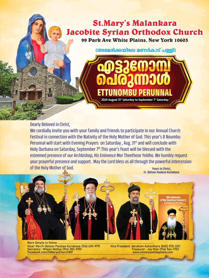 ന്യൂയോര്‍ക്ക്‌: വൈറ്റ്‌ പ്ലെയിന്‍സ്‌ സെന്റ്‌ മേരീസ്‌ യാക്കോബായ സുറിയാനിപ്പള്ളിയില്‍ വിശുദ്ധ ദൈവമാതാവിന്റെ ജനന പെരുന്നാളിനോടനുബന്ധിച്ച് ആണ്ടുതോറും നടത്തപ്പെടാറുള്ള എട്ടു നോമ്പാചരണവും, പുണ്യ ശ്ലോകനായ ബസേലിയോസ് പൗലോസ് ദ്വിതീയൻ കാതോലിക്കാ ബാവായുടെ ഇരുപത്തിഎട്ടാമത് ദുഖ്‌റോനോ പെരുന്നാളും, ഇടവകയുടെ വലിയ പെരുന്നാളും ആഗസ്റ്റ് 31 ശനിയാഴ്‌ച മുതല്‍ സെപ്റ്റംബർ 7 ശനിയാഴ്‌ച വരെ എട്ടു ദിവസങ്ങളിലായി ഭക്തി ആദരപൂർവം നടത്തപ്പെടുന്നു.