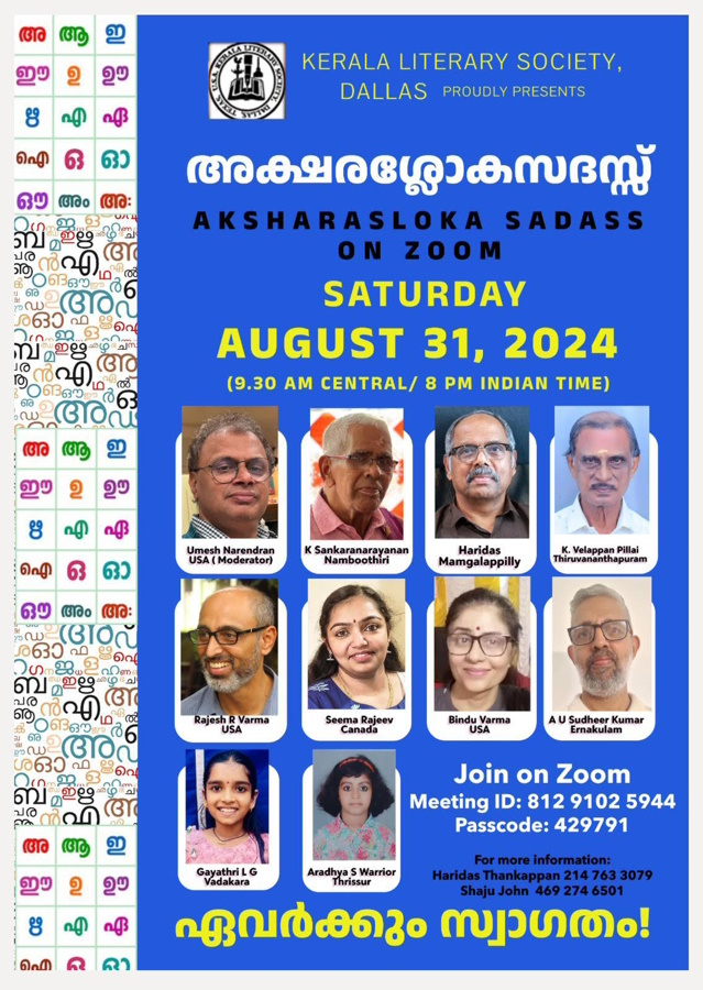 ഡാളസ് : ആഗസ്റ്റ് 31 ശനിയാഴ്ച (രാവിലെ 9.30 സെന്റ്രൽ ) കേരളാ ലിറ്റററി സൊസൈറ്റി ഓഫ് ഡാളസ് അക്ഷരശ്ലോകസദസ്സ് സംഘടിപ്പിക്കുന്നു. നോർത്ത് അമേരിക്കയിൽ നിന്നും മിഡിൽ ഈസ്റ്റിൽ നിന്നും കേരളത്തിൽ നിന്നുമുള്ള അക്ഷരശ്ലോകപ്രവീണർ പരിപാടിയിൽ പങ്കെടുക്കും.